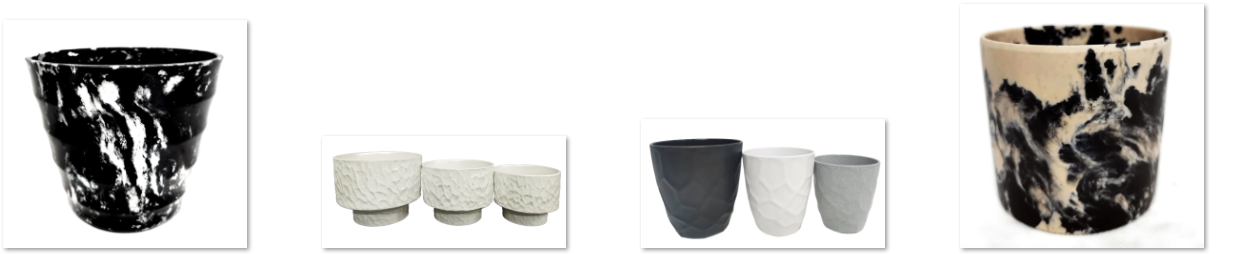 颜色五彩斑斓:有普通的素色,仿云石,水磨石,水泥色,土陶色,马卡龙彩色,有圣诞色,电镀色,斑点色等,适合于小盆栽,多肉,蝴蝶兰,绿植,热带植物,圣诞树等盆载,符合客户各个季节所需产品的花盆。
